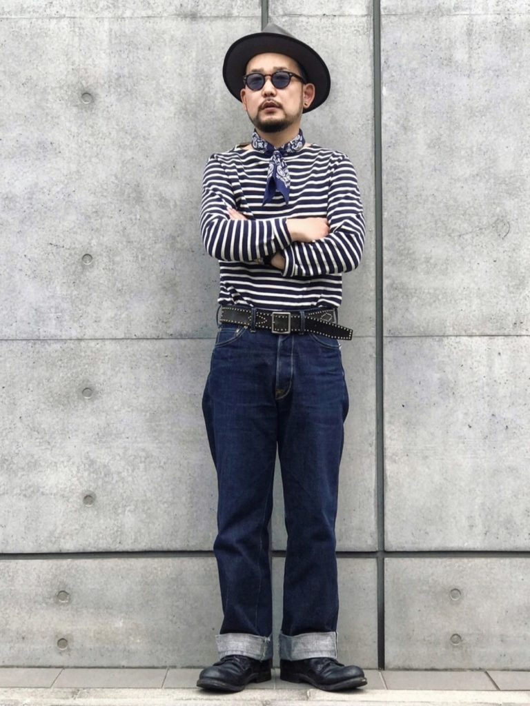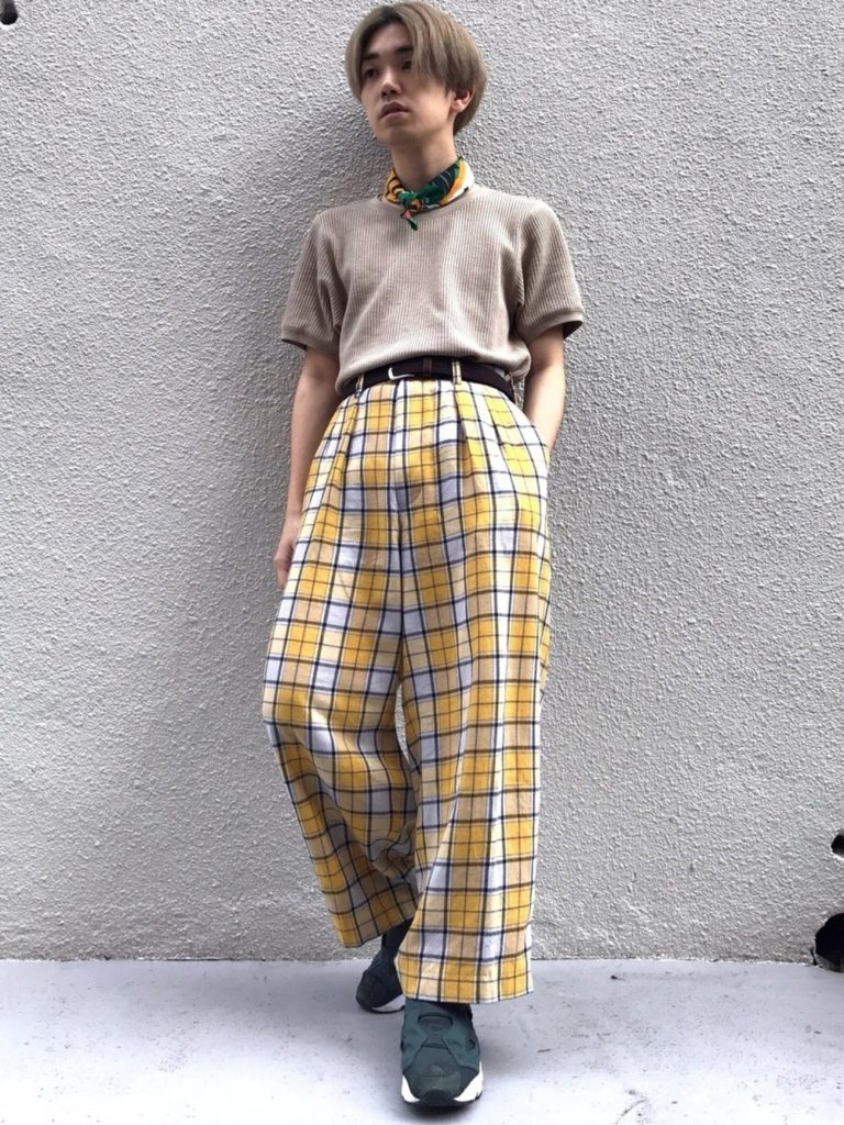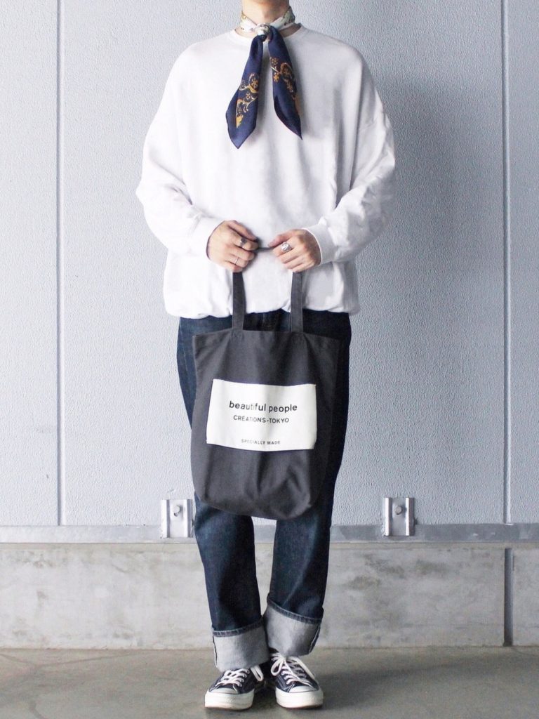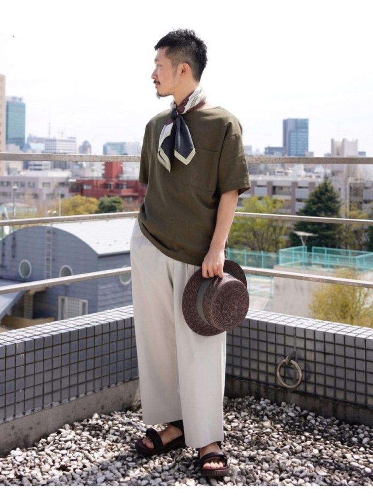 スカーフを合わせる際に王道となるコーデはこれ。ルーズな雰囲気のふわっとした着こなしに、ハズしのビビッドな青バンダナをセットしコーデの印象を引き締めている。ホワイトやグレーのTシャツに差し色を組み合わせ注目を集めるのは1番ベーシックなテクニック。