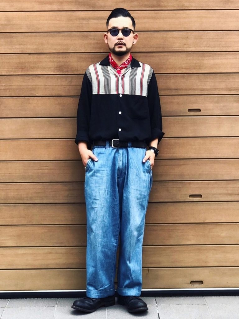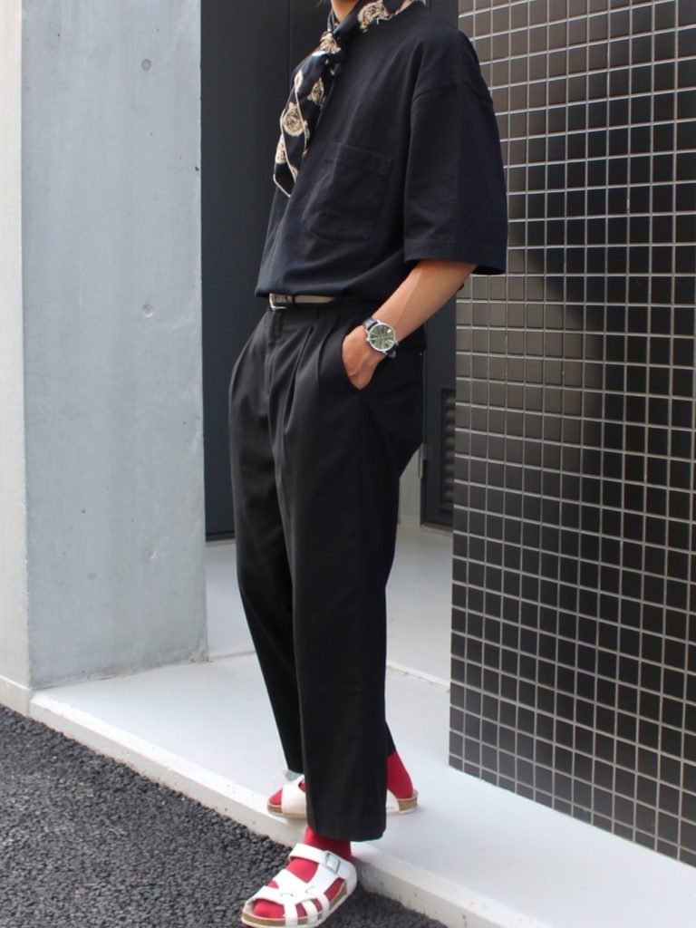 よく上半身のアイテムと靴の色を合わせるとコーデが締まると聞きますが、同じような原理。その代わりの足元のサンダルとビビットカラーの赤靴下で雰囲気とも相まったイイ感じの崩しがコーデの魅力を際立たせている。