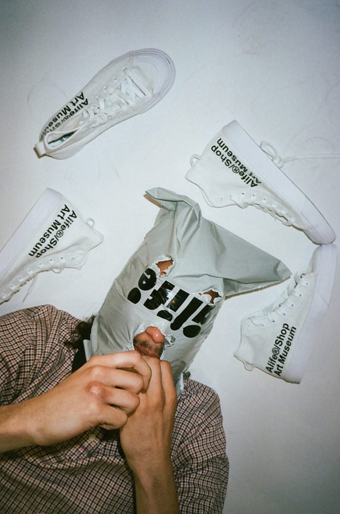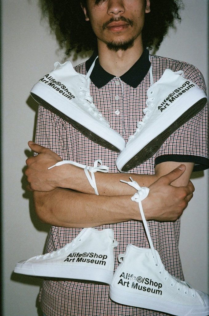 今作も、前回と同様にホワイトカラーの「NIZZA HI」をベースに採用し、アッパーのサイドには「Alife®/Shop Art Museum」の文字をデザイン。