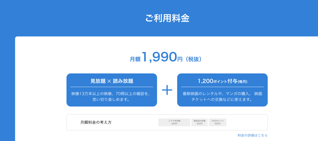 U-NEXTは料金(1,990円)が高いですが、サービス内容はトップクラスの充実ぶりで、特に電子書籍の配信は他のサービスに無い魅力の1つ。