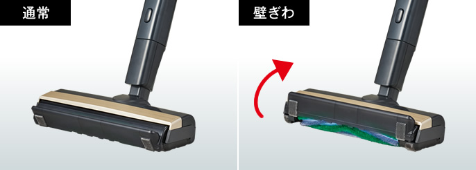 ゴミを吸引するヘッド部分は「ガバ取りパワーノズル」という、前面が開く構造になっており、壁際も問題なくし使用可能。