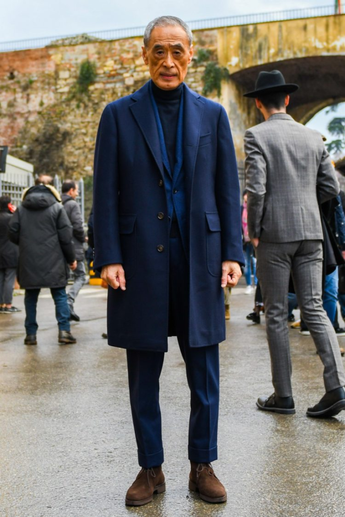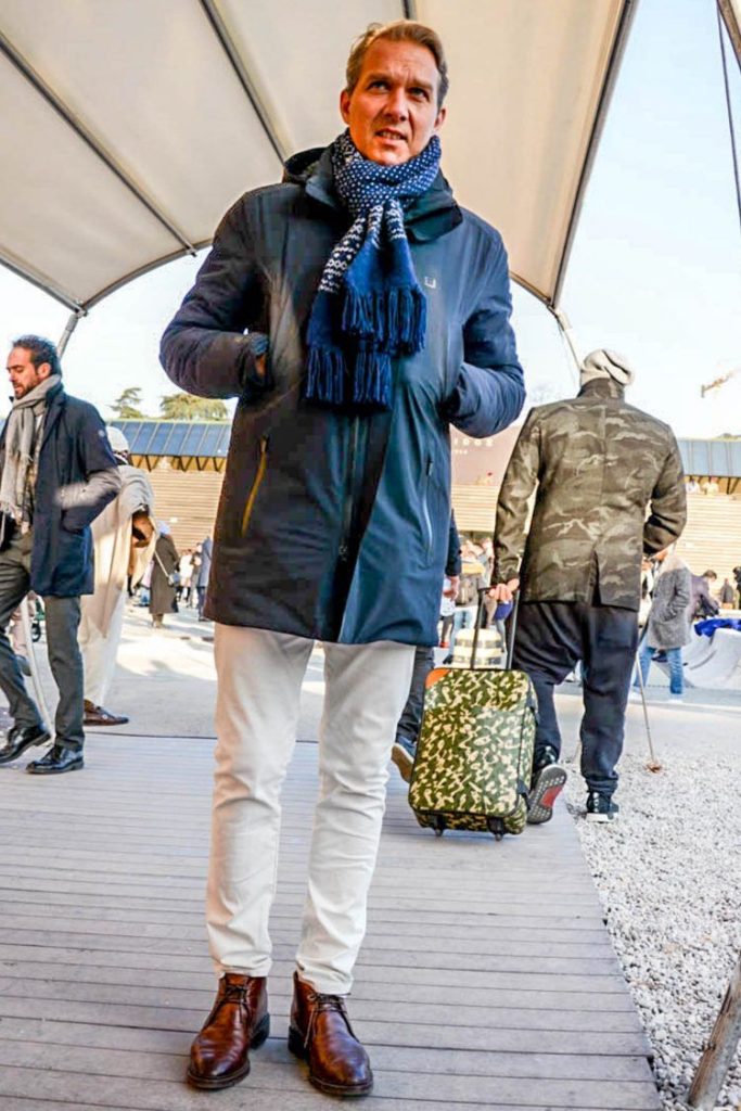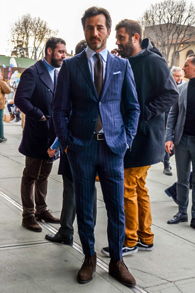 日本では、少しNG扱いになってしまうかもしれないが、スーツに合わせて履くことも可能である。