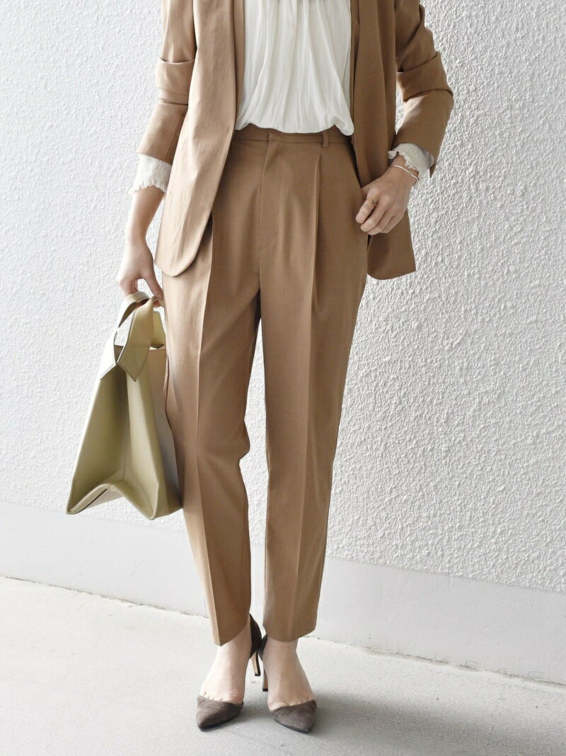 スタイルよく見せたい方におすすめのでテーパードパンツ、ゆとりがありつつ裾丈に向かって細くなるシルエットなので、上品な着こなしができる。